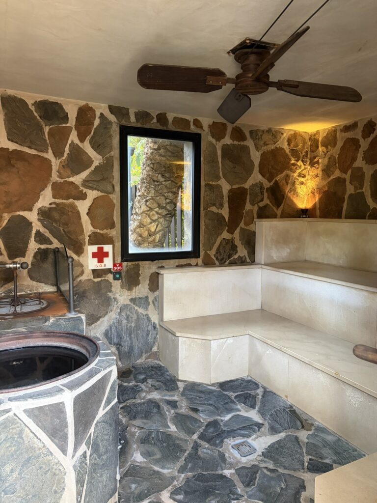Everything is surrounded by mature palm trees and lush greenery. It feels like a private oasis.